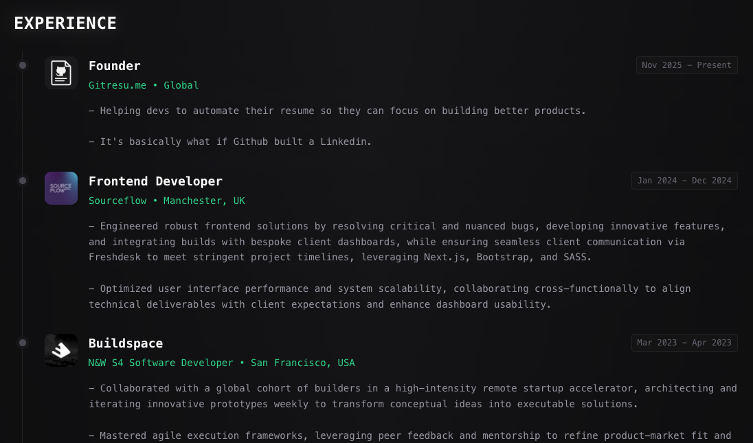 No tedious setup. No manual updates. Connect your GitHub and your professional resume is live instantly.